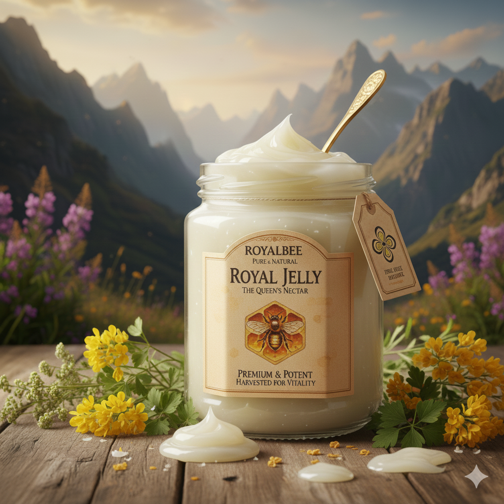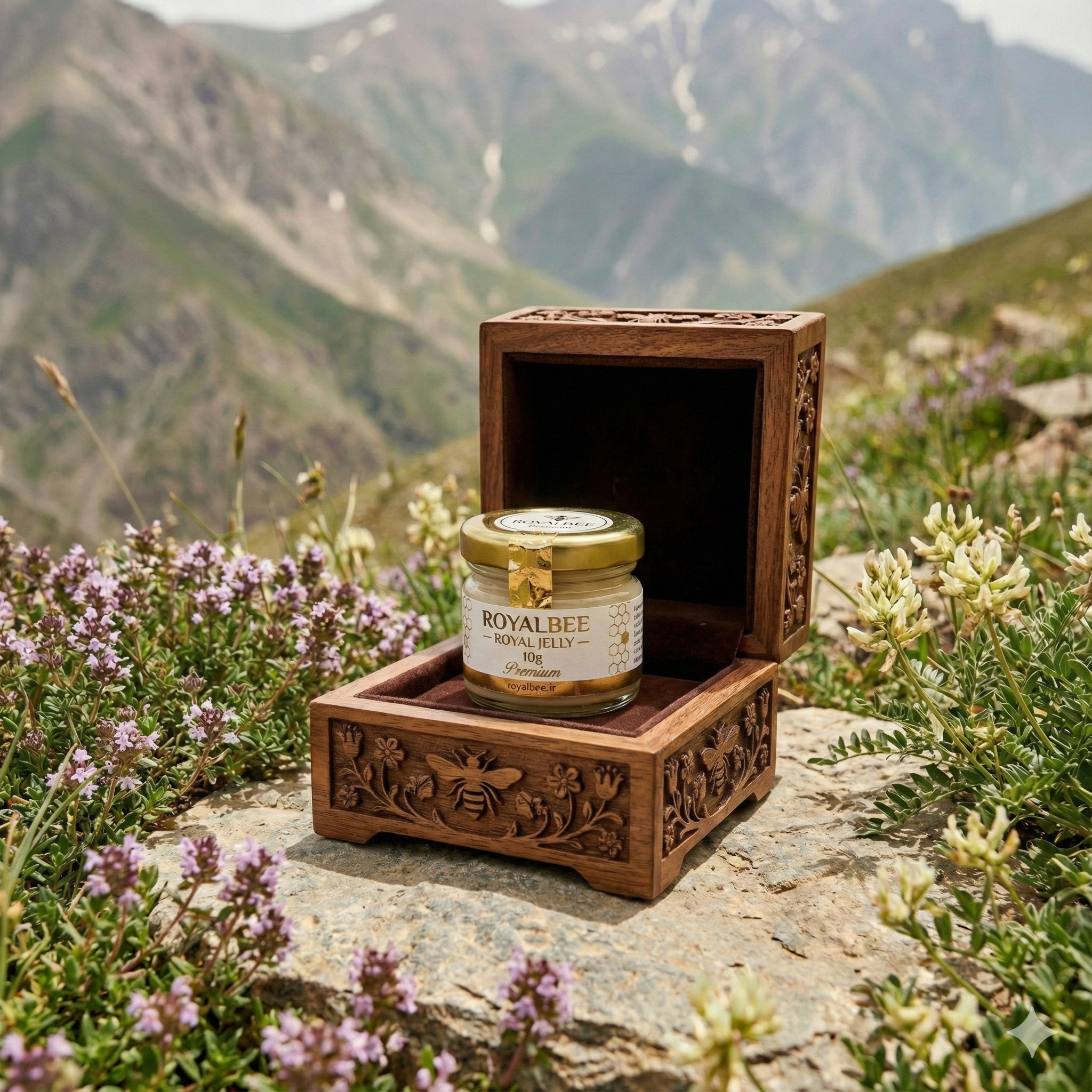 ژل رویال رویال بی بهصورت کاملاً تازه، اصل و طبیعی تهیه شده و سرشار از ویتامینهای گروه B، پروتئینها، اسیدهای آمینه ضروری، هورمونهای طبیعی و آنتیاکسیدانهای بسیار قوی است.
